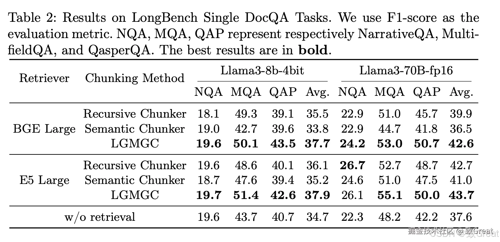 模型和实现细节:使用8位量化的Llama3-8b进行Logits-Guided Chunker和LGMGC的实现。所有策略都在不同的块大小θ(200, 300, 500词)下进行评估,以评估它们对这一超参数的敏感性。