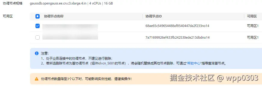 - 由于主要进程运行在首协调节点上,因此首协调节点无法缩容,首协调节点可通过查询实例的组件列表接口查询(组件id=cn_5001的节点为首协调节点)。当选择首节点缩容时,将随机替换为其他协调节点进行缩容。