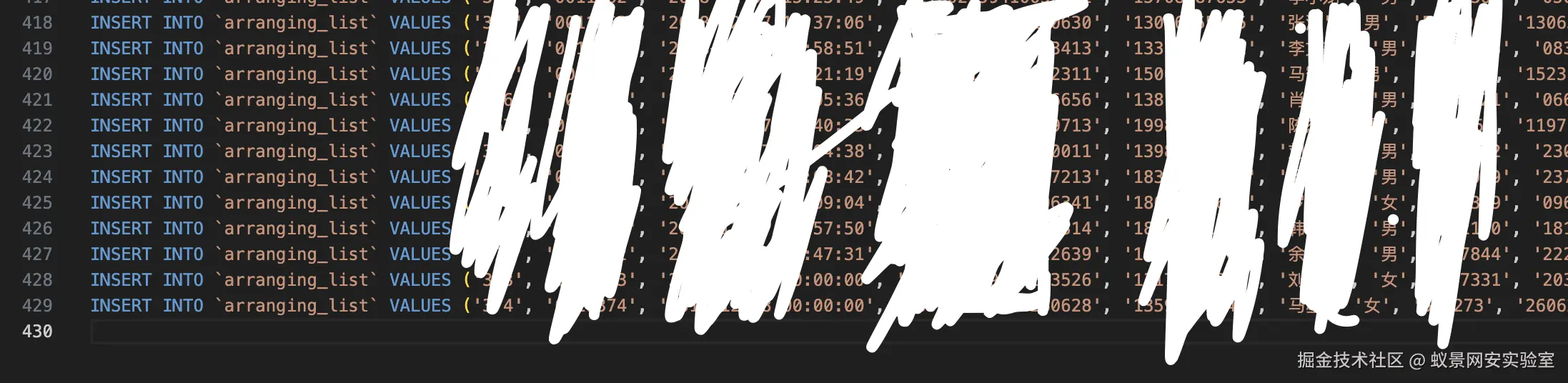 再翻找文件,发现居然直接把后台部分用户的信息写在了.sql文件内,包含姓名,身份证,电话等信息,不过只有几百条。