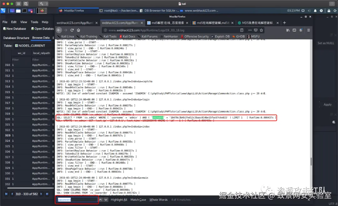 并通过找到最新的日志信息,找到密码hash值,通过cmd5实现解密并成功进入后台: