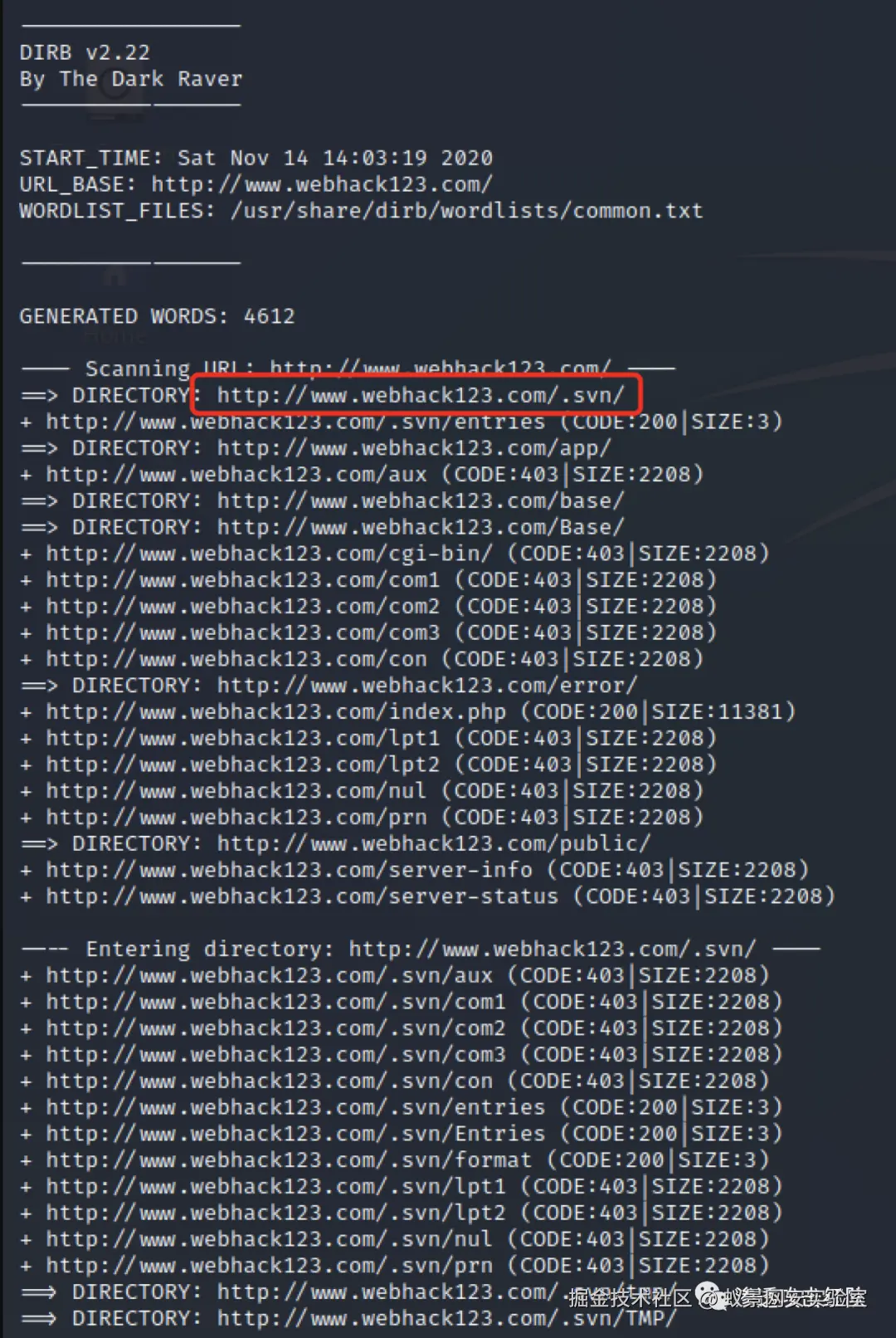 并通过dirb扫除.svn泄露: