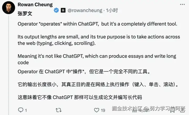 X 平台大 V @rowancheung 也提前体验并分享了对 Operator 的观察。