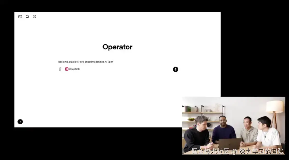 按照惯例,OpenAI 也同期召开了一场发布会。Sam Altman 与 Yash Kumar、Casey Chu 和 Reiichiro Nakano 一起介绍和演示 Operator。