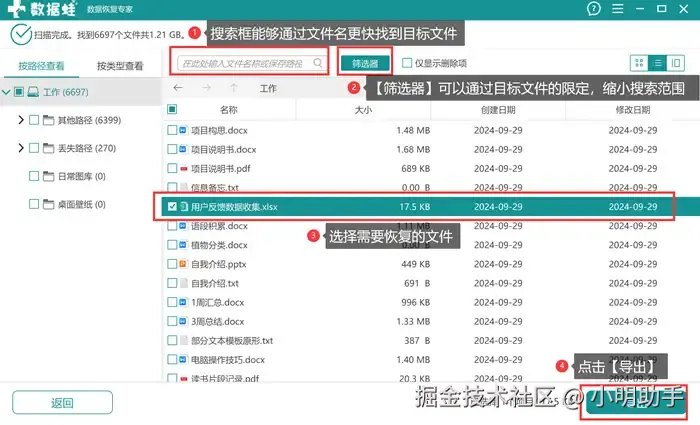 第2步: 等待软件的扫描结束后,会在页面的中间显示扫描文件的列表,用户可以在指定位置选择自己要进行恢复的目标文件,选择好后,点击右下角的【导出】;