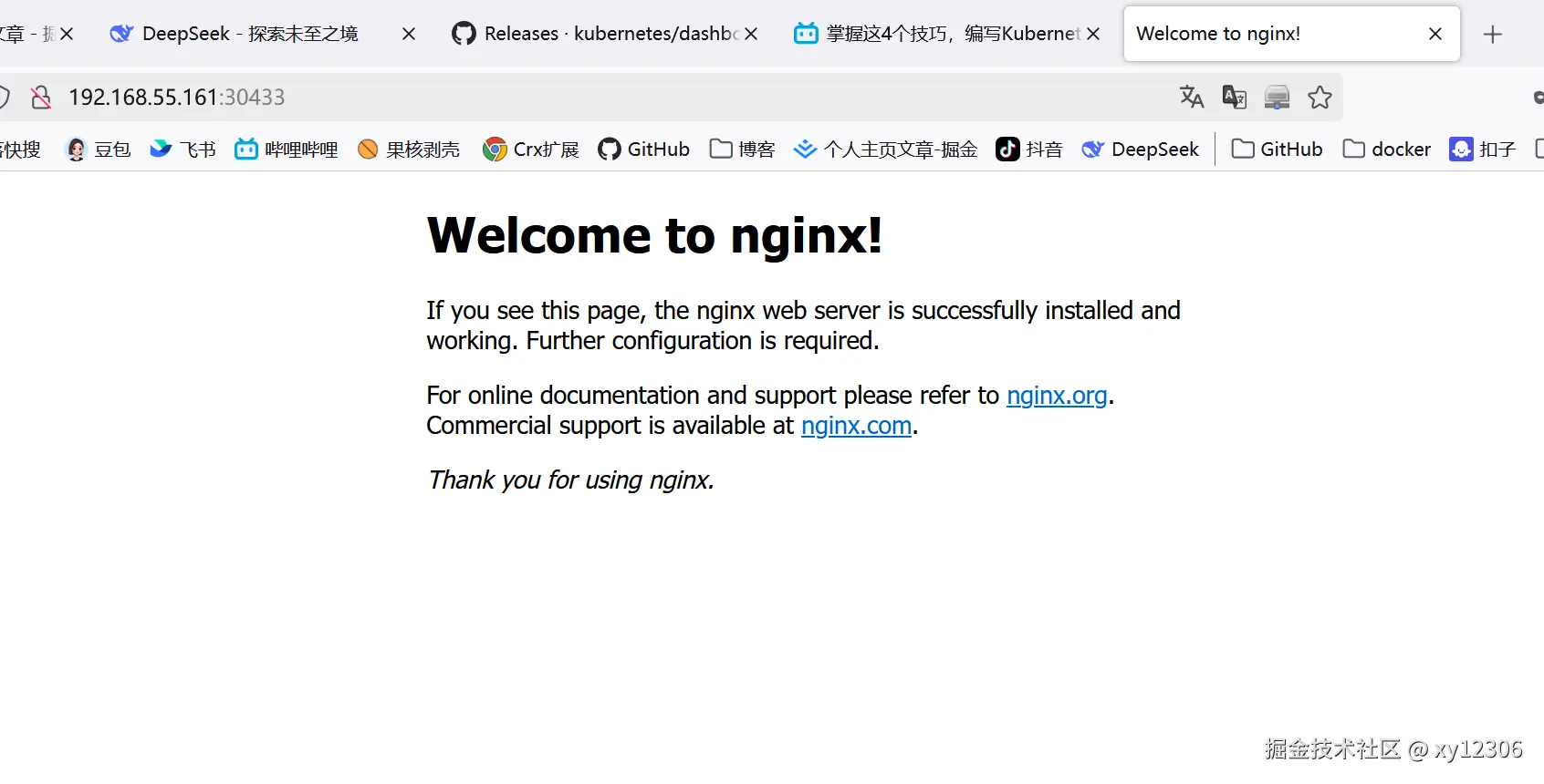 使用查看节点的 IP 地址kubectl get nodes -o wide和 NodePort 端口(30433)访问 Nginx。您可以通过以下方式访问: