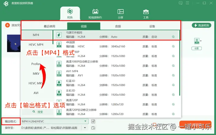 步骤2:点击【输出格式】选项,选择视频格式列表,点击【MP4】格式。
