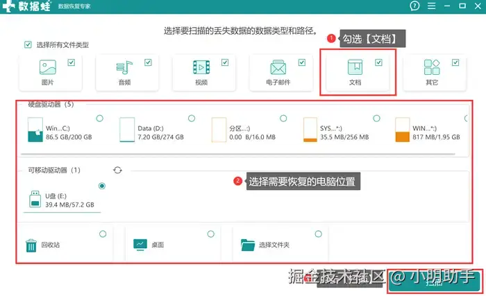 步骤1: 打开数据 蛙恢复专家,在软件的主页面上选择需要恢复的文件类型(表格文件选择【文档】),然后再选择扫描的位置(即表格数据丢失的位置),最后点击【扫描】。