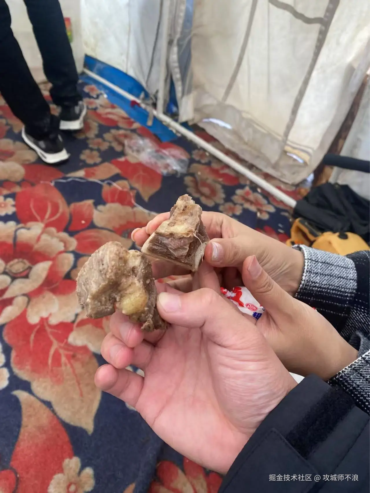 爬山的时候遇到了冰雹,被热心的藏族同胞收留进他们的移动帐篷,还吃上了本地最纯正的牦牛肉(有一丢丢腥),品尝了正宗的酥油茶。