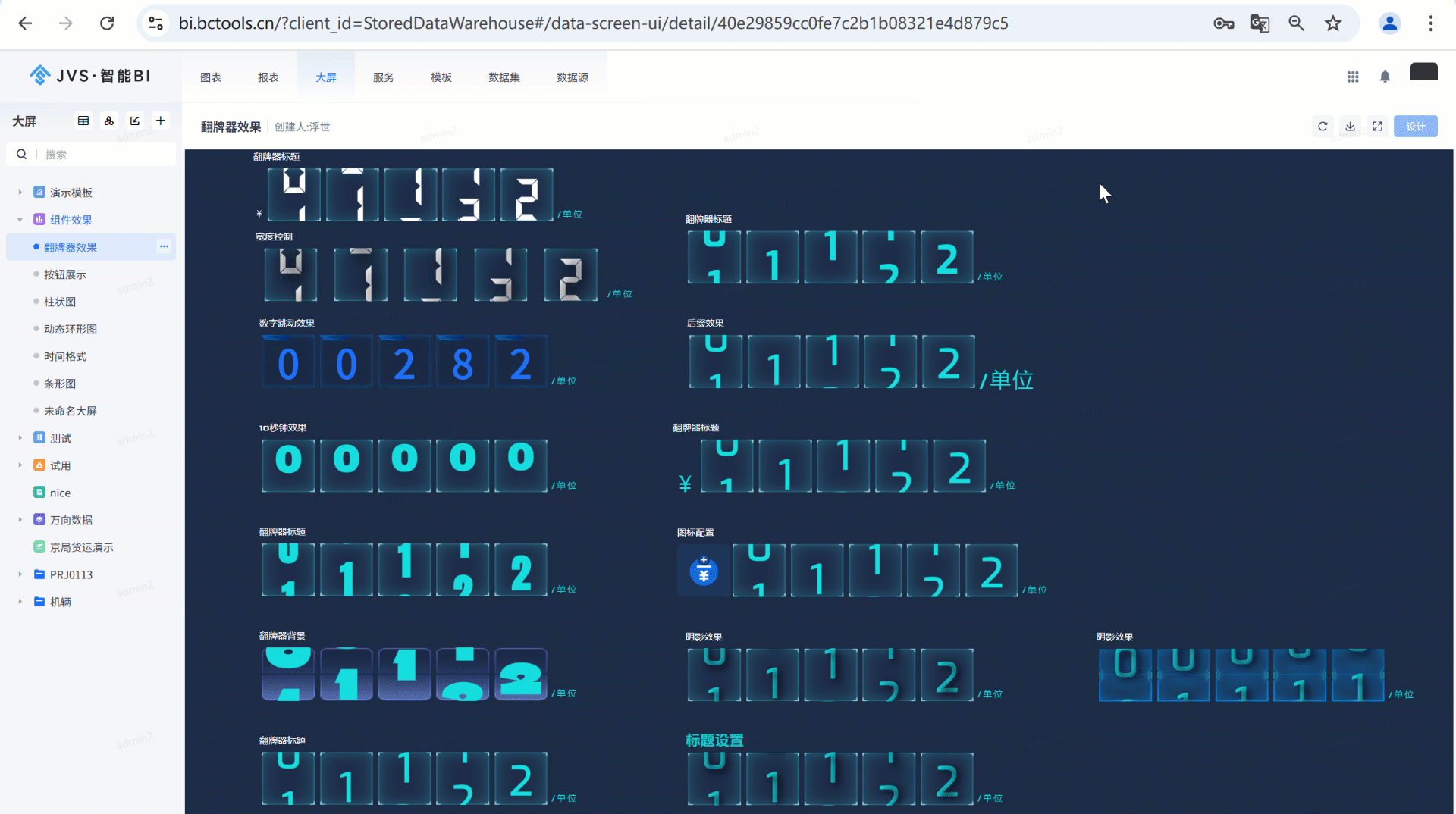 数字翻牌器是一种用于数字显示的特殊效果组件,常用于大屏设计中以动态展示数据的变化过程。数字翻牌器由若干个数字板组成,每个数字板上包含0~9十个数字中的一个。数字板之间通过一定的动画效果(如翻转、滑动等)进行数字的更新和变化,实现数字的连续显示和滚动更新。