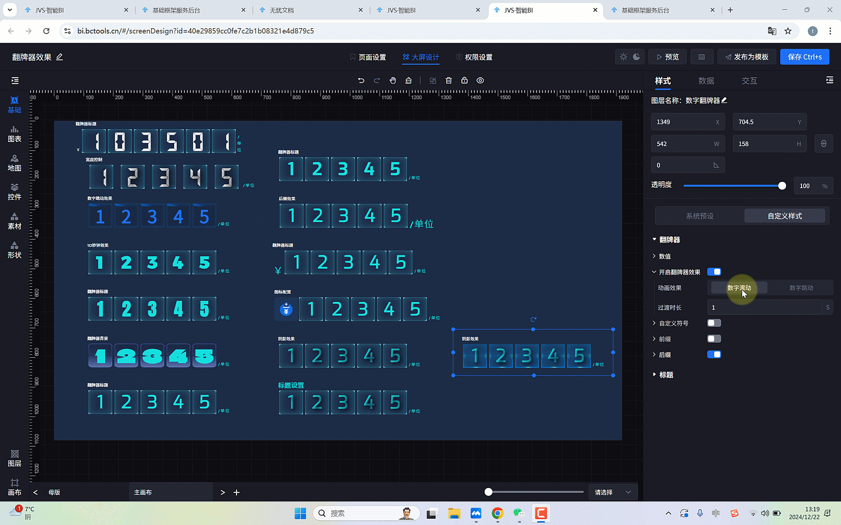 数字翻牌器的效果:跳动、翻转,如下图所示,可以设置数字效果与效果执行的时长。