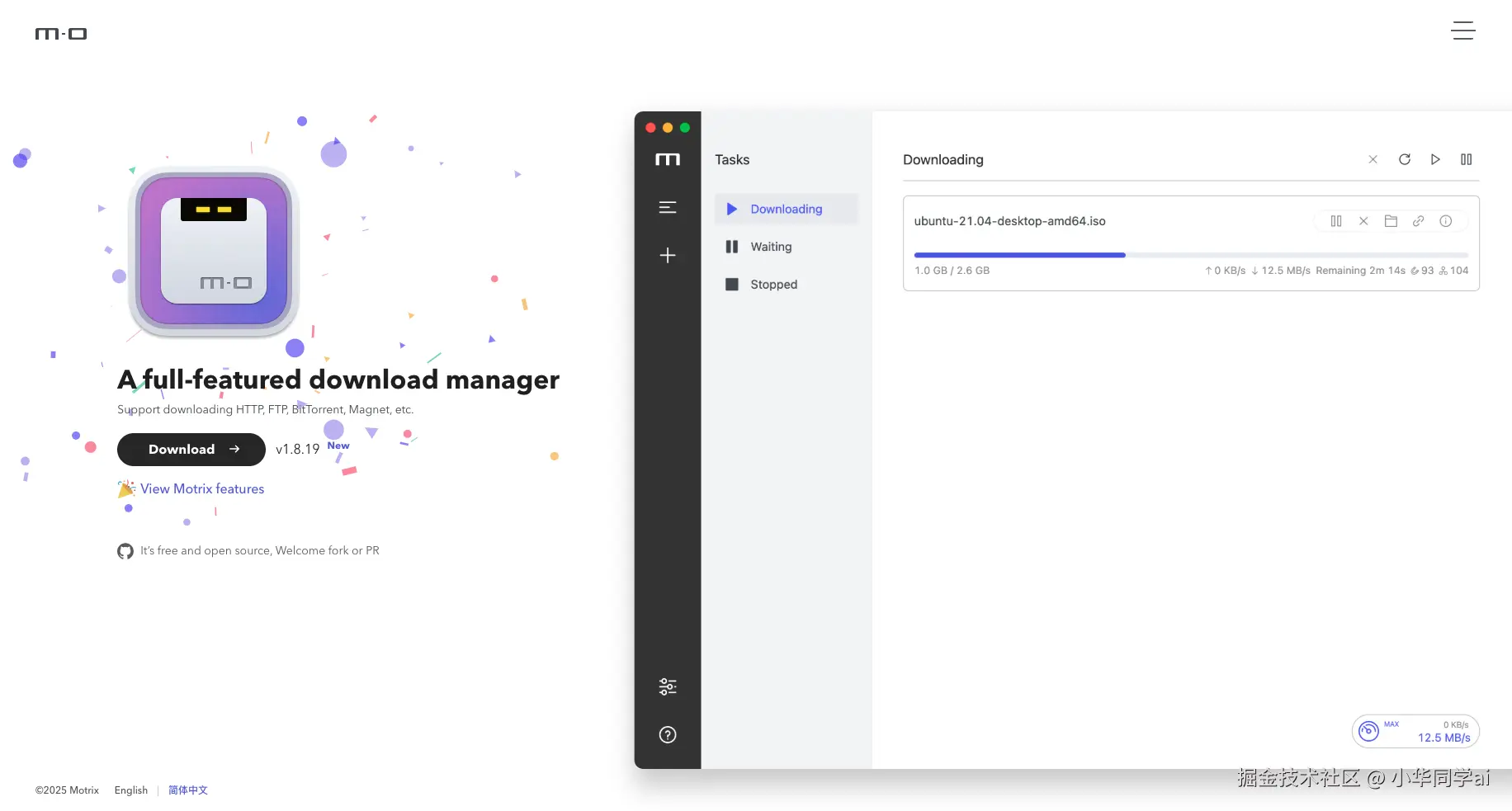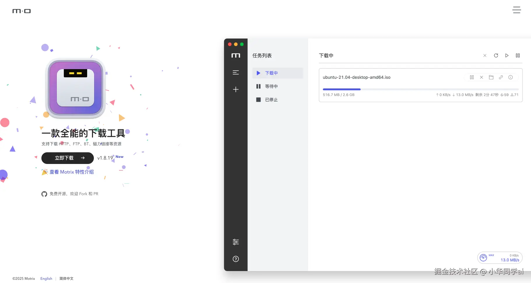 Motrix是一款支持HTTP、FTP、BitTorrent、Magnet等多种下载协议的全能下载管理器。它拥有简洁易用的界面,强大的下载功能,让你轻松管理各种下载任务。