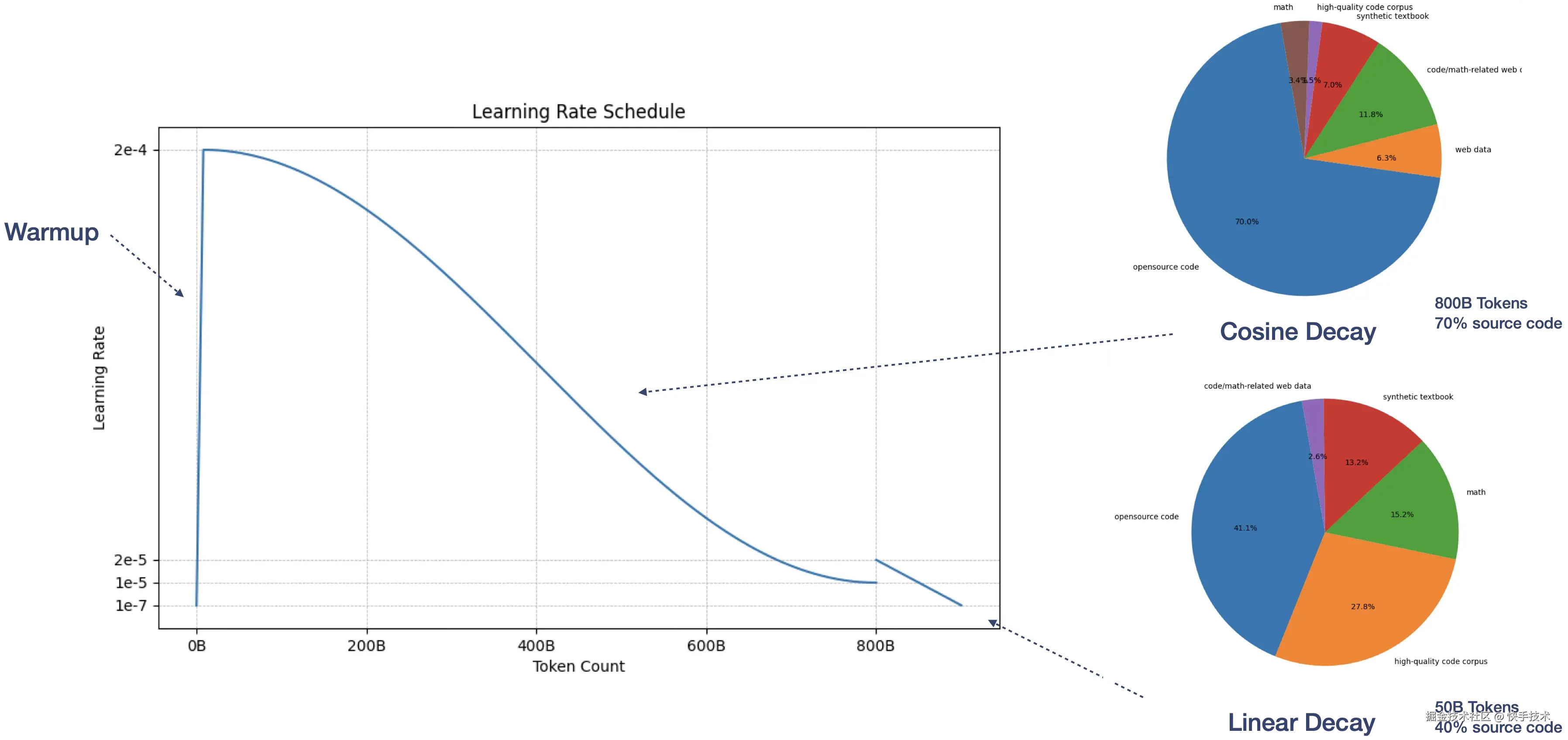 我们构造了 3T 的高质量预训练数据集,包括代码、数学与知识类文本语料。对于源码数据,我们依照研发场景的实际使用情况对编程语言分布和过滤策略进行了优化。为了提升语料中的知识浓度,我们使用了基于模型的过滤方法,并追加了更多高质量合成数据。多阶段训练中的详细语料分布如下图所示(左预训练,右退火)
