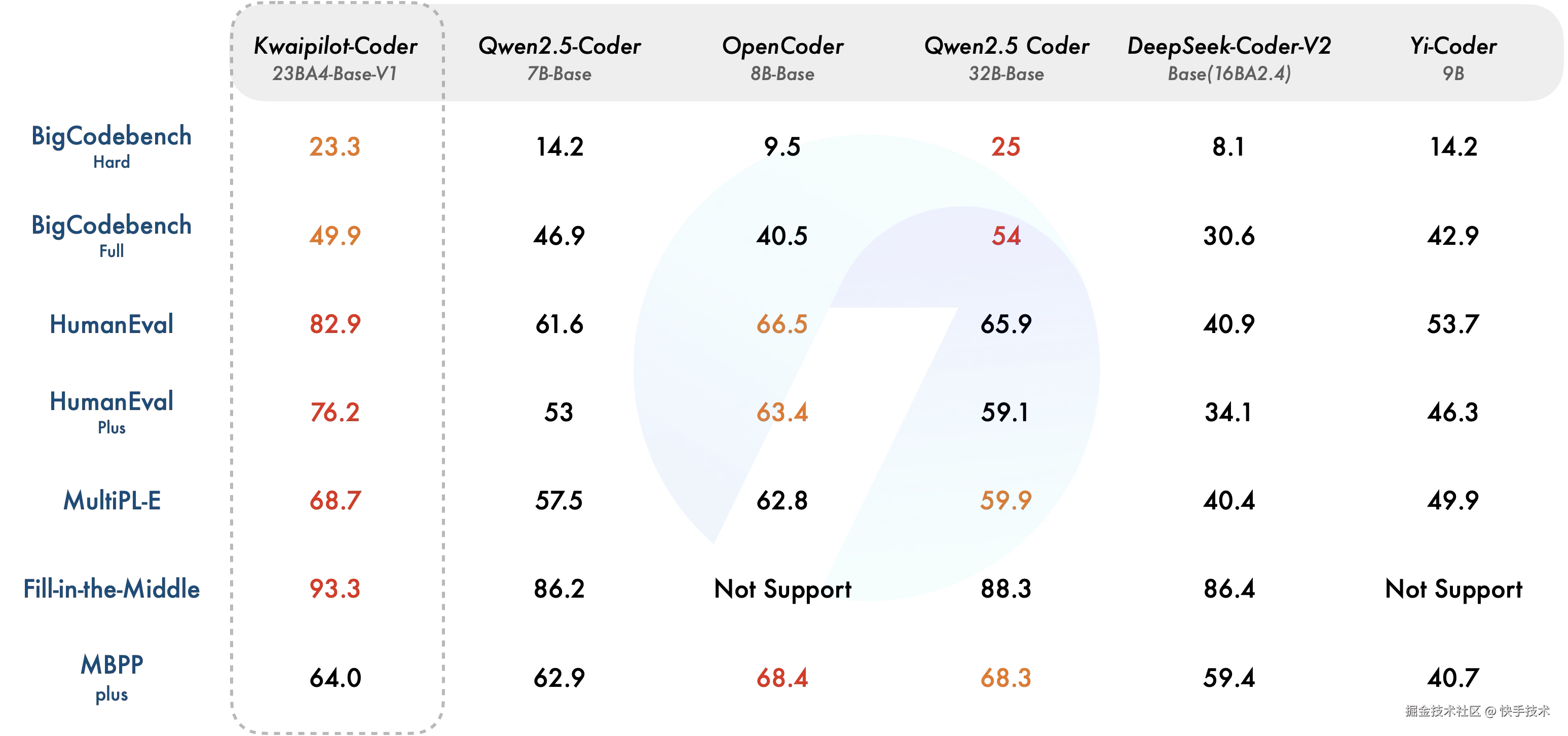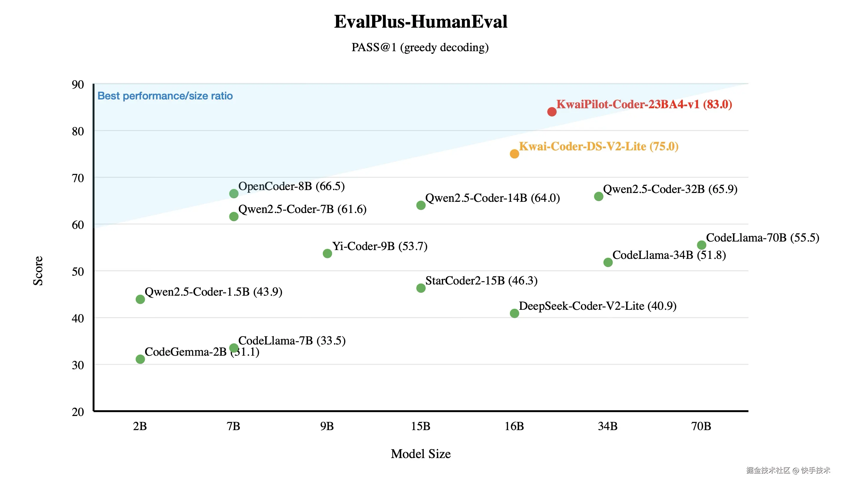 KwaiCoder-23BA4-v1 在 HumanEval 和 HumanEval+测试集上的 Pass@1 指标上分别达到 82.9%和 76.2%,超过了目前最好的 Base 模型(OpenCoder-8B),达到了 SOTA 水平。