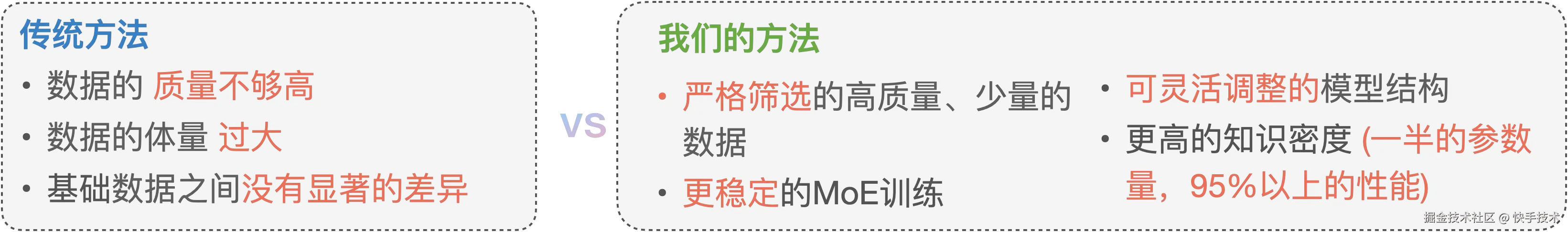 因此许多模型训练厂商采用基于 base 模型直接进行 cpt 的方式完成模型训练的需求。但是这种方案无法按需更改模型的结构、tokenzier、Attention 实现,也难以根据自身的模型集群状况 (卡的型号,显存带宽的大小等) 制定最合理的参数规模。
