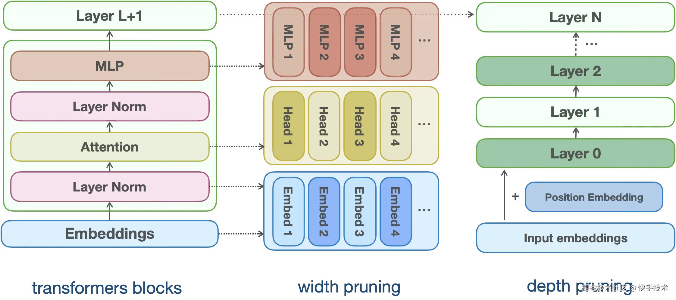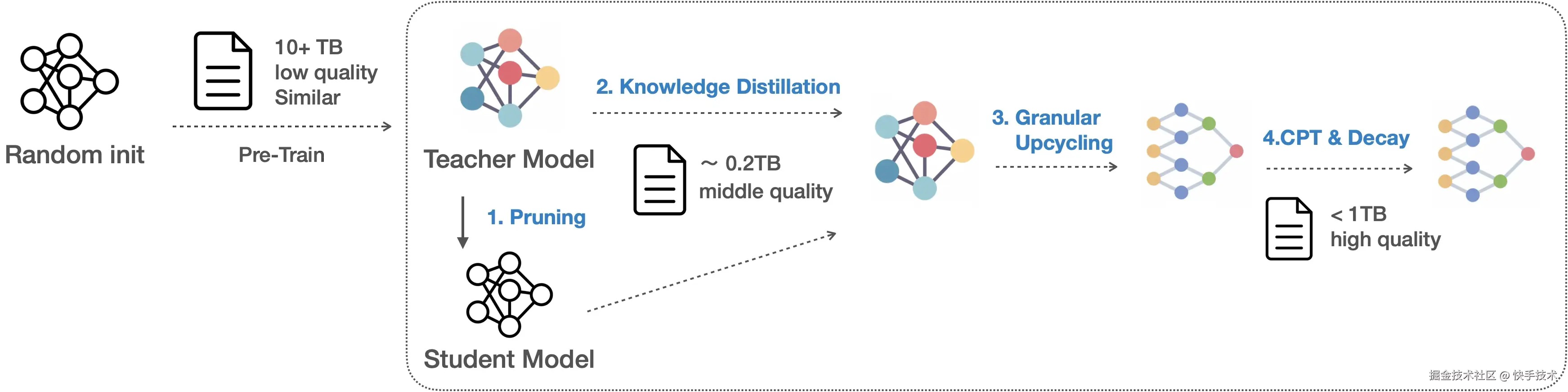 于是为了完成我们对模型结构的定制化需求,权衡模型的训练成本,我们决定使用 Pruning(模型裁剪) + 知识蒸馏(Knowledge Distillation)+ 细粒度合并(Granular Upcyling) 的技术路线。