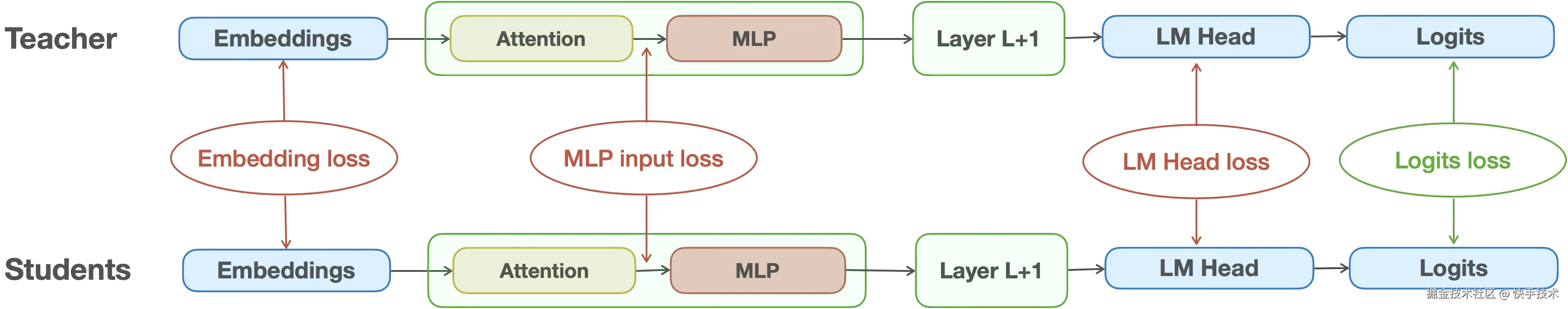 再将裁剪前的模型作为教师模型,裁剪后的模型作为学生模型进行在线知识蒸馏。对模型的中间结果与 logits 进行蒸馏,以进一步缩小教师模型与学生模型的差距。