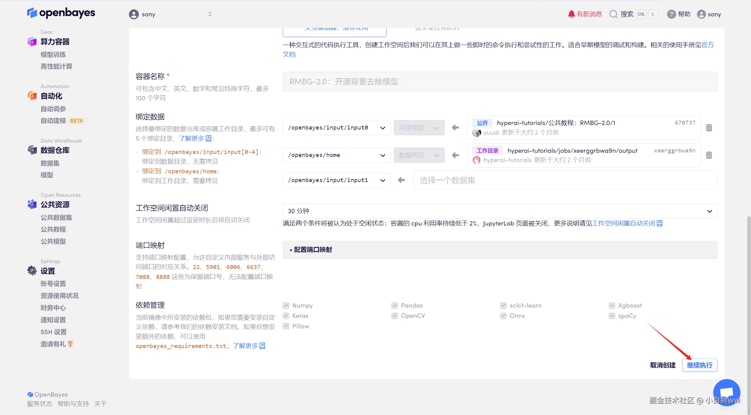 选择「NVIDIA GeForce RTX 4090」以及「PyTorch」镜像,OpenBayes 平台上线了新的计费方式,大家可以按照需求选择「按量付费」或「包日/周/月」,点击「继续执行」。可以使用文章开头的邀请链接,获得 RTX 4090 使用时长!