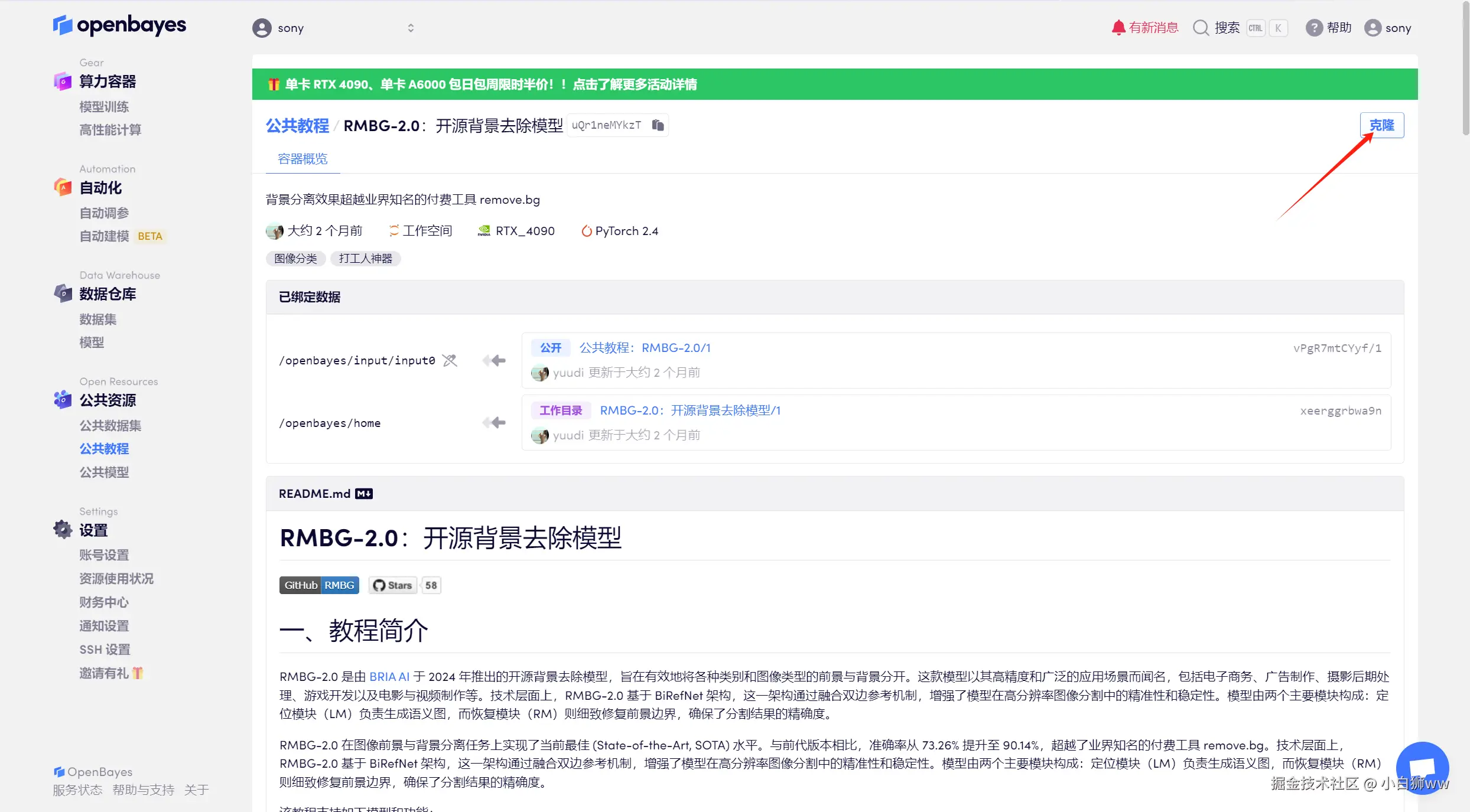 登录 OpenBayes.com,在「公共教程」页面,选择「RMBG-2.0:开源背景去除模型」教程。