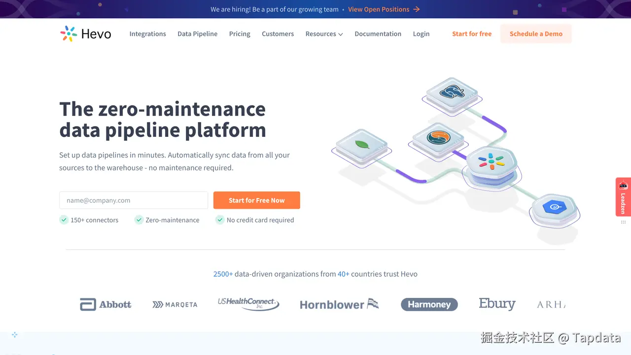Hevo 是一款零维护的数据管道平台,可自动同步来自 150+ 数据源的数据,包括SQL、NoSQL 与各种 SaaS 应用。该平台拥有超过 100 个预构建好的的原生集成,还针对部分特定的数据源 API 进行了优化。借助 Hevo,可以灵活控制数据入仓的方式,只需执行相应的清理、格式化和筛选等动态操作即可,且不会影响系统的负载性能。