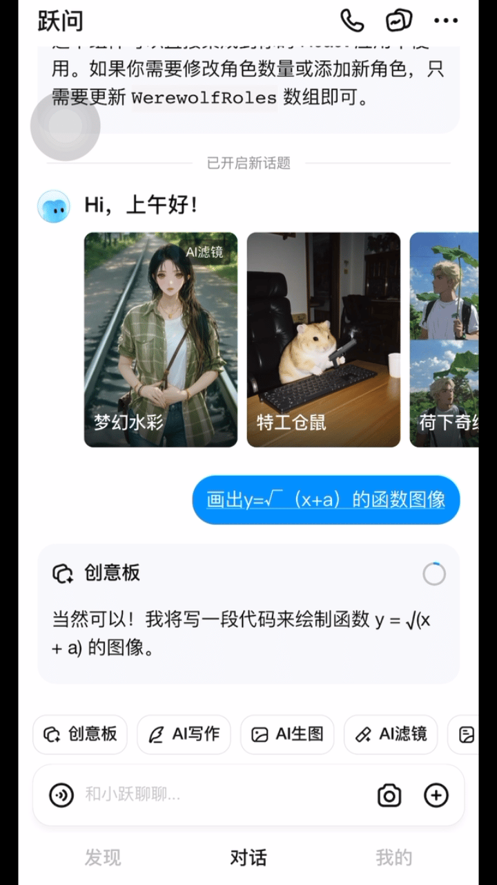 当然,也可以直接在对话框中输入 prompt“用创意板生成 / 制作 / xxx”、“用你的代码创作能力,给我 xxx”,跃问也能自动识别你的意图,然后调用创意板。