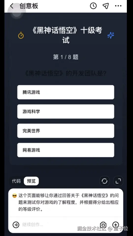 据统计,跃问新上的这个创意板,是目前国内第一个「应用与游戏生成方向」的功能。