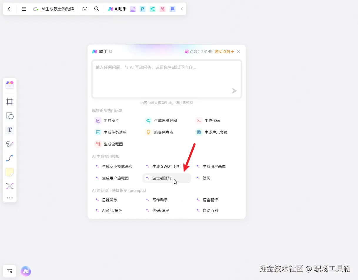 在绘制波士顿矩阵时,传统的手工绘制方法往往耗时且容易出错。随着人工智能的发展,拥有AI加成的绘图软件boardmix的出现,为企业提供了高效的解决方案。boardmix内置强大的AI绘图功能,用户只需输入想分析的公司或产品名称,便可一键生成专业的波士顿矩阵图。这种工具不仅提高了工作效率,还降低了人为错误的风险。