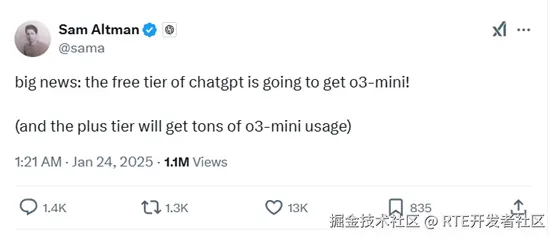 OpenAI 联合创始人兼首席执行官 Sam Altman 宣布了一个大消息——免费版 ChatGPT,将提供 o3-mini 模型。