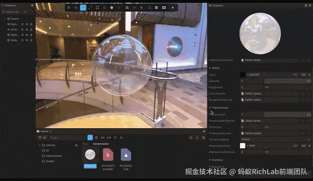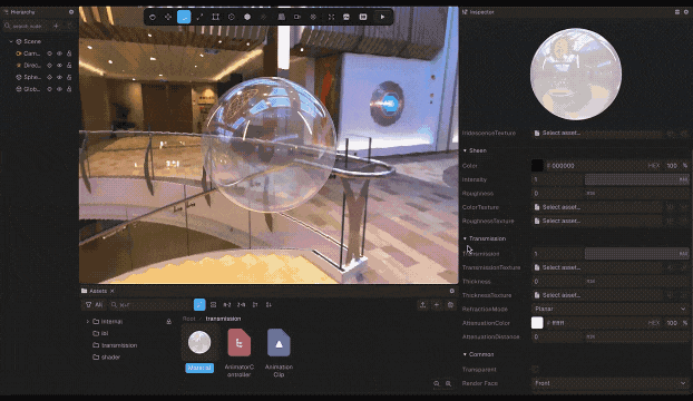 此次版本对 PBR 材质 进行了升级,新增 Sheen(光泽)、Transmission(透射)和 Refraction(折射)效果,并全面支持兼容这些特性的 glTF 插件,支持模型导入时效果的无缝还原,无需额外转换操作。