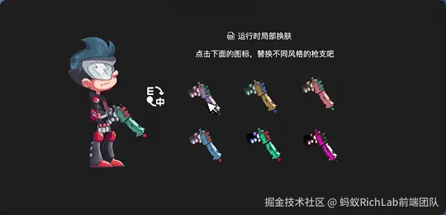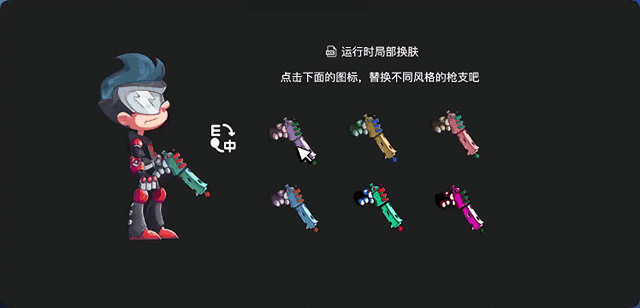 支持单独上传 Spine Atlas 并可独立加载,基于加载的 TextureAtlas 产物,可以实现运行时局部换肤,你可以在新的编辑器模板中看到下面的示例。