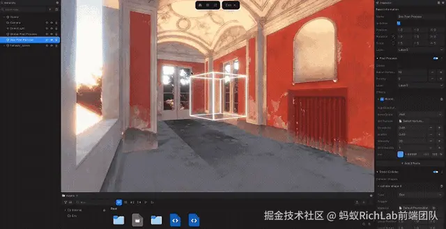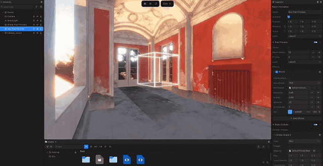 新增局部后处理功能,可以在场景中根据局部空间定制后处理效果。并且支持多个后处理组件的效果混合,系统会根据权重和优先级自动混合,例如场景中包含多个局部后处理时,相机在场景移动的过程中后处理效果也会自然过渡。