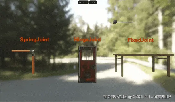 - FixedJoint: 将两个碰撞器组合在一起,例如将木棍与铁块组合成一个锤子。