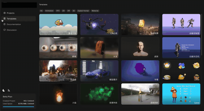 基于以上的亮点功能,我们新增了 13 个对应的案例,你可以直接在编辑器的 Templates(模板) 中选择感兴趣的案例,快速体验和学习这些功能。