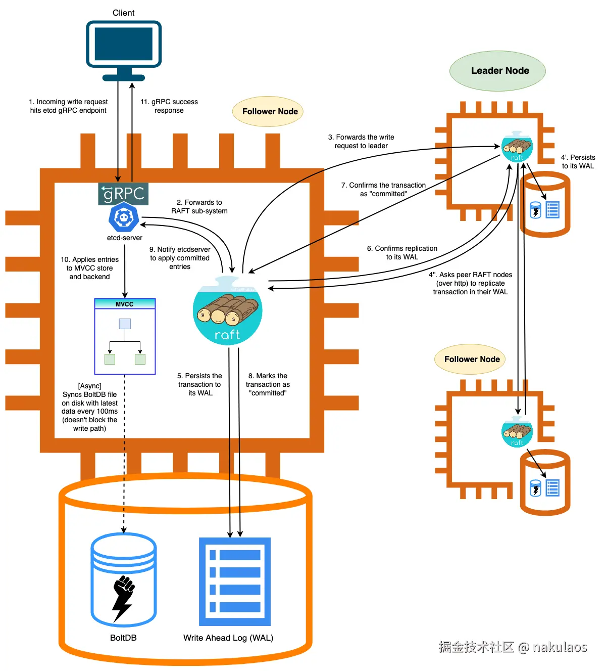 - leader节点将写请求持久化到其WAL中,并向其他follower节点发送同步消息,并要求它们复制该数据到各自的WAL中,之后对应的follower 接待你返回响应