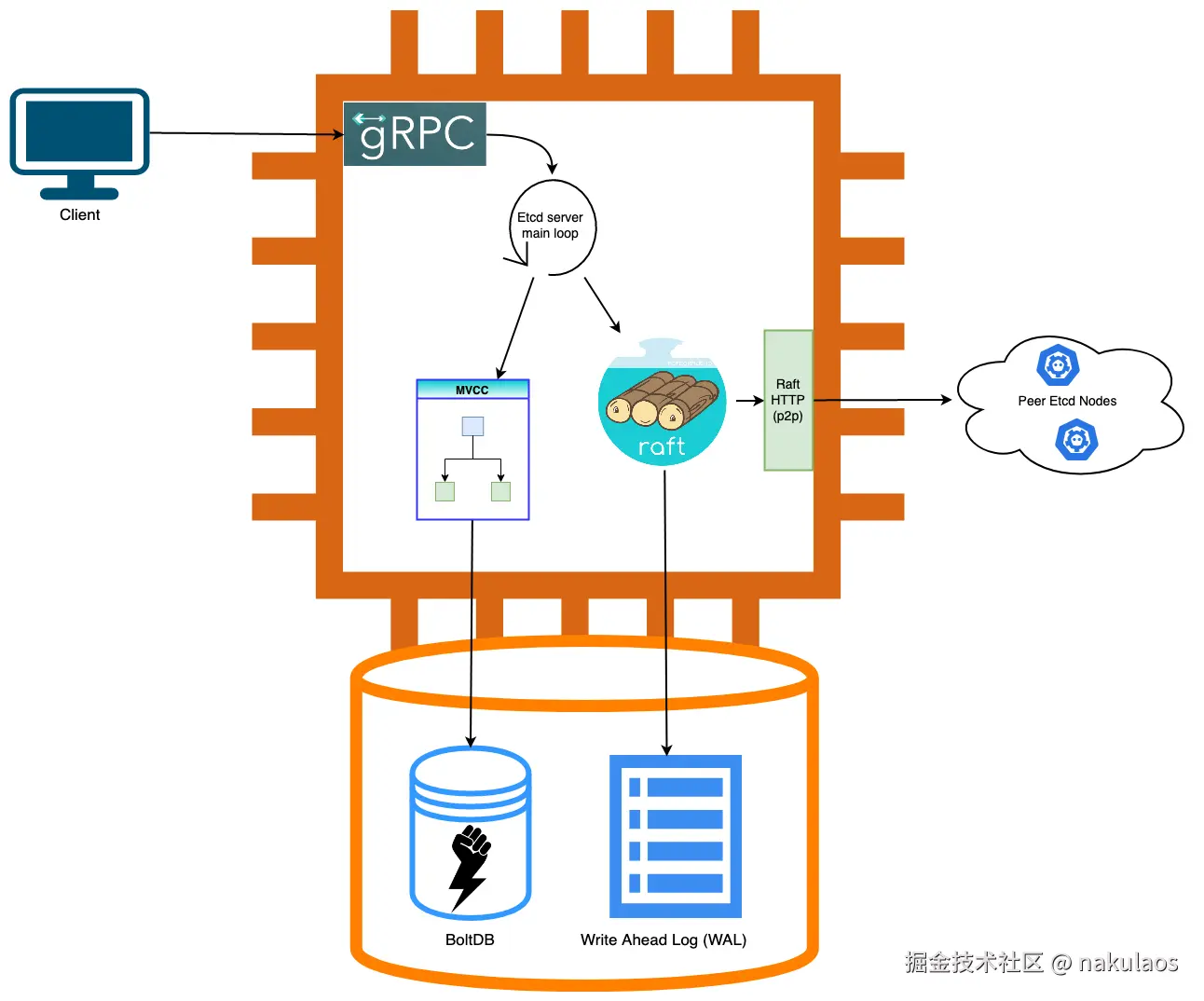 存储层:存储层包含预写日志 (WAL) 模块、快照 (Snapshot) 模块、boltdb 模块。其中 WAL 可保障 etcd crash 后数据不丢失,boltdb 则保存了集群元数据和用户写入的数据。