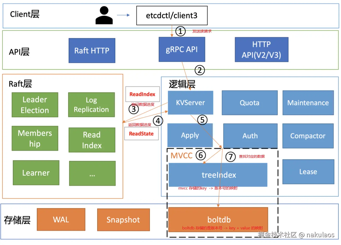 Raft 算法层:Raft 算法层实现了 Leader 选举、日志复制、ReadIndex 等核心算法特性,用于保障 etcd 多个节点间的数据一致性、提升服务可用性等,是 etcd 的基石和亮点。
