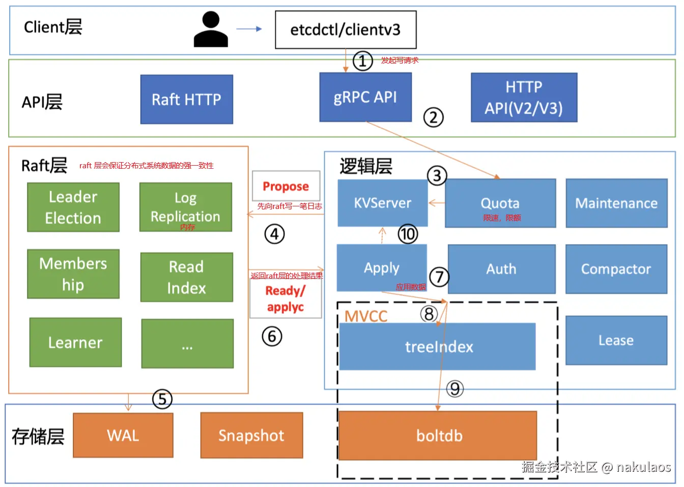 按照分层模型,etcd 可分为 Client 层、API 网络层、Raft 算法层、逻辑层和存储层。这些层的功能如下:
