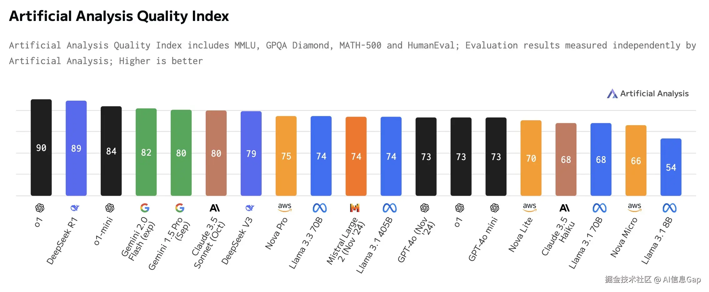 OpenAI慌了,Meta慌了,坚信“算力崇拜”的人都慌了。DeepSeek用自家的模型告诉所有人:规模定律(Scaling Law) 不是万能的。附上一张来自Artificial Analysis的模型评估图。
