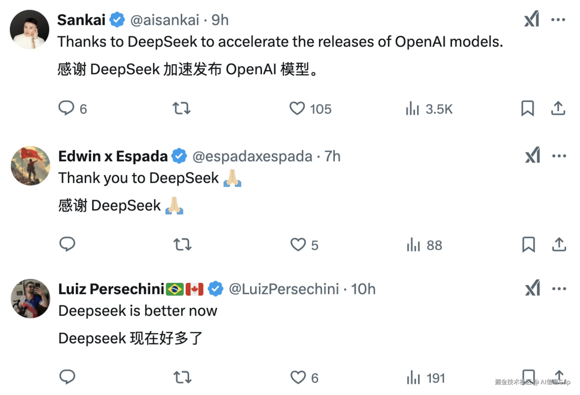 这也有了后来的OpenAI宣布即将推出的新模型o3-mini向所有用户开放使用。要知道,傲娇的OpenAI以往发布新模型都是付费用户优先体验的。即便如此,群众的眼睛都是雪亮的,网友们感谢的依旧是那个“低调奢华有内涵”的DeepSeek。