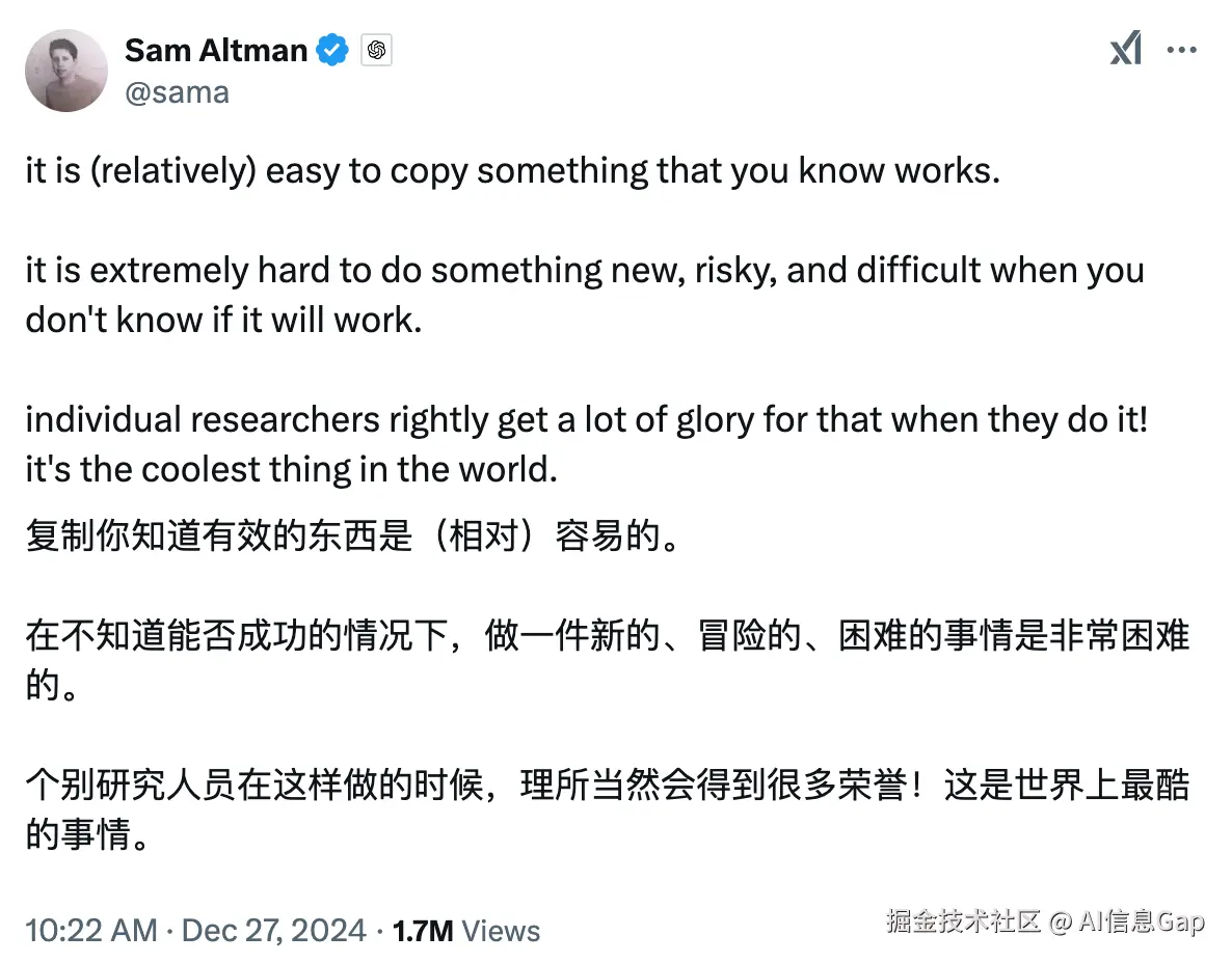 2024年12月27日,OpenAI CEO Sam Altman发了一条“意有所指”的帖子:复制你知道有效的东西是(相对)容易的。在不知道能否成功的情况下,做一件新的、冒险的、困难的事情是非常困难的。(it is (relatively) easy to copy something that you know works. it is extremely hard to do something new, risky, and difficult when you don't know if it will work.)