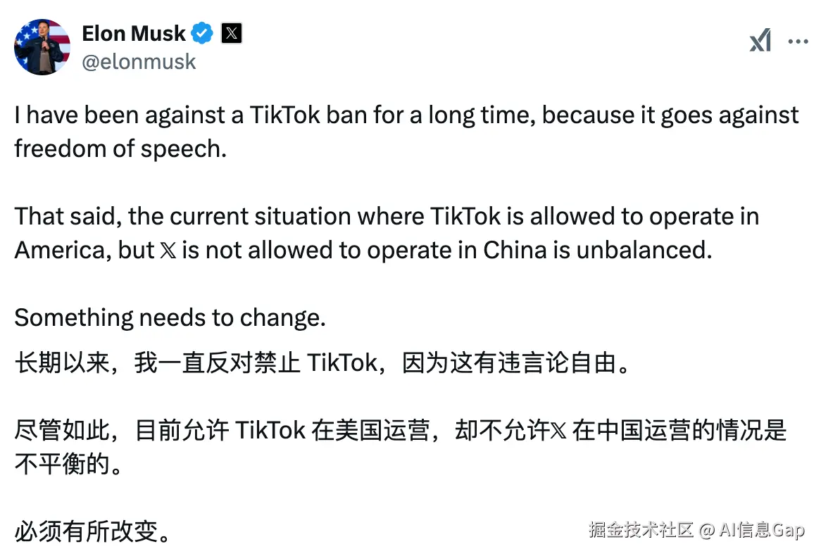 这流量,马一龙(马斯克)见了都眼馋:长期以来,我一直反对禁止TikTok,因为这有违言论自由。尽管如此,目前允许TikTok在美国运营,却不允许𝕏在中国运营的情况是不平衡的。