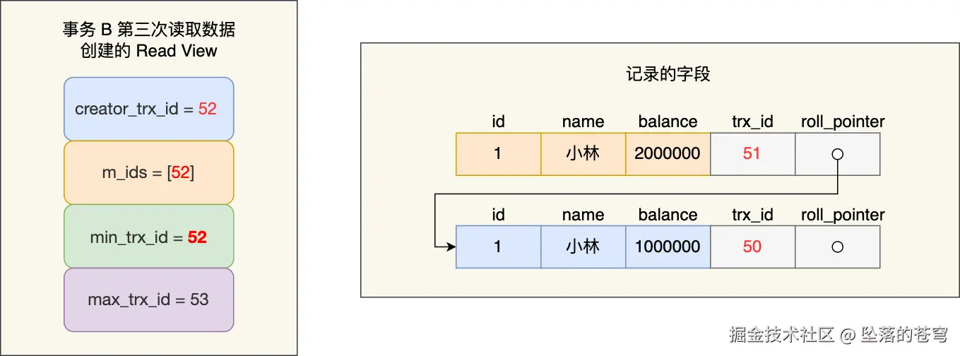 事务 B 在找到小林这条记录时,会发现这条记录的 trx_id 是 51,比事务 B 的 Read View 中的 min_trx_id 值(52)还小,这意味着修改这条记录的事务早就在创建 Read View 前提交过了,所以该版本的记录对事务 B 是可见的。