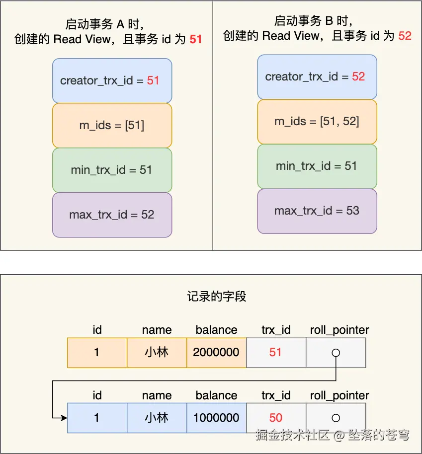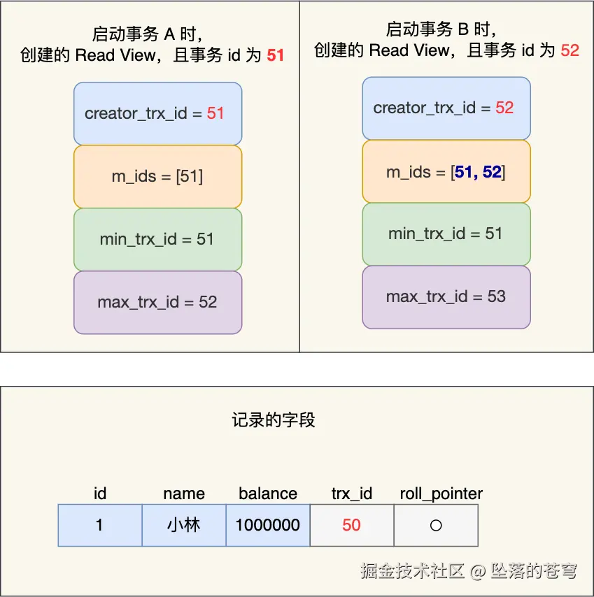 事务 A 和 事务 B 的 Read View 具体内容如下: