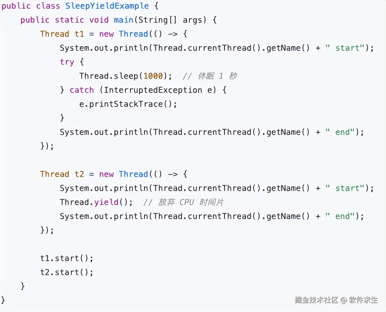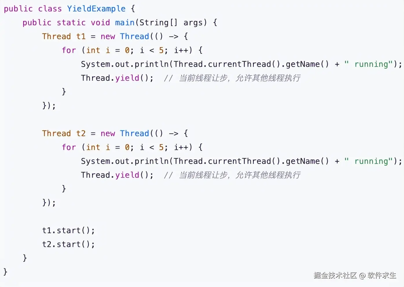 yield() 的作用并不像 sleep() 那样强制线程停止,而是给了线程调度器一个提示:“我愿意暂停,给其他同等优先级的线程执行机会。”