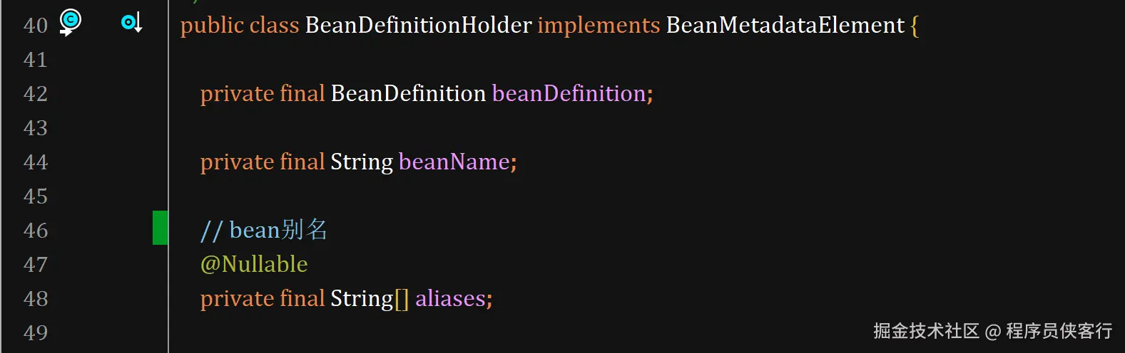 BeanDefinitionHolder类只是对BeanDefinition的包装,仅有三个属性:beanDefinition、beanName和aliases。