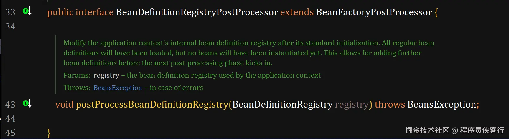 可见,该接口是BeanFactory的后置处理器,在创建Bean实例前,干涉 BeanDefinition 创建和更新。 仅有一个方法: