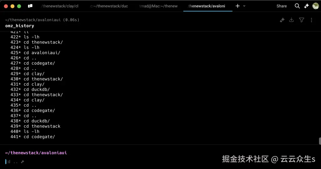 如果我随后使用cmd–z退出Ghostty,重新启动会正确重置我的窗口。有趣的是,我拥有与Warp相同的会话历史记录。我认为omz_history管理着这种共享历史记录行为: