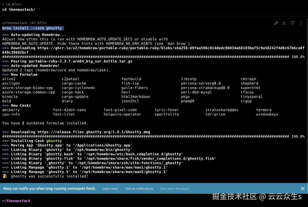 请注意,Warp为长时间运行的命令(进程)提供了通知。这是一个在终端上简洁高效地完成某些操作的很好的例子。如果你查看顶部,你会看到当Warp块完成(已完成的命令调用和响应)时,它会记录所花费的时间。