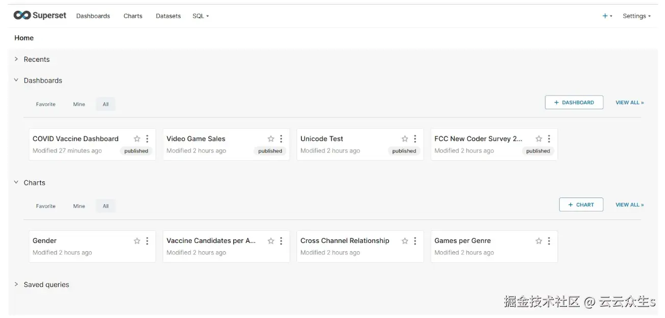 登录后,您将进入此主屏幕,您可以在其中创建仪表板、图表和数据集。第一步是创建一个数据集,我们为可视化提供表或视图。