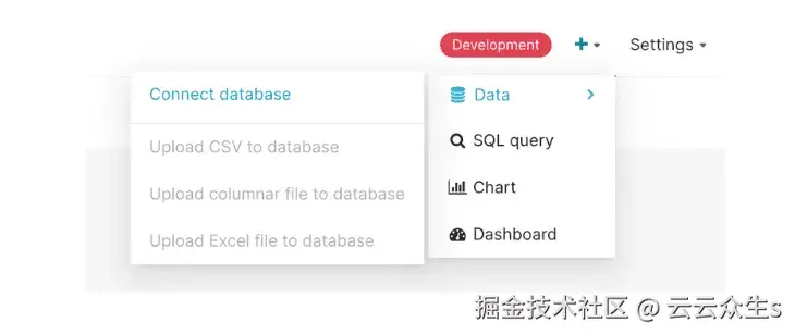 选择右上角的**+按钮,然后选择数据 → 连接数据库**。