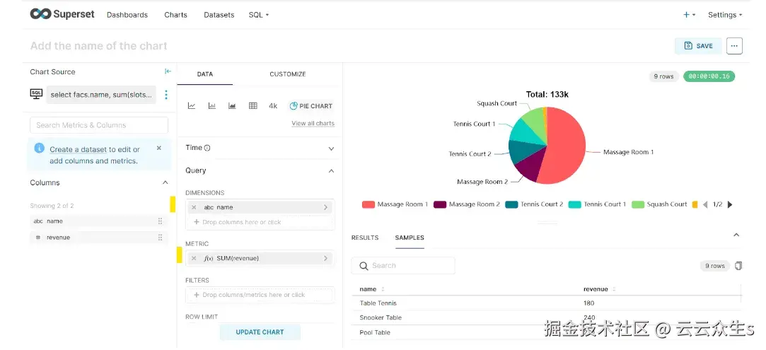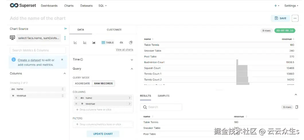 注意: 即使我们有可用于查询的原始数据,Superset也需要聚合。解决方法是进行无意义的聚合,就像我们上面所做的那样,即SUM(Revenue)。您可以在Stack Overflow上了解更多信息,或访问此Apache Superset GitHub页面。
